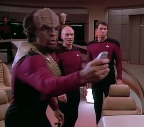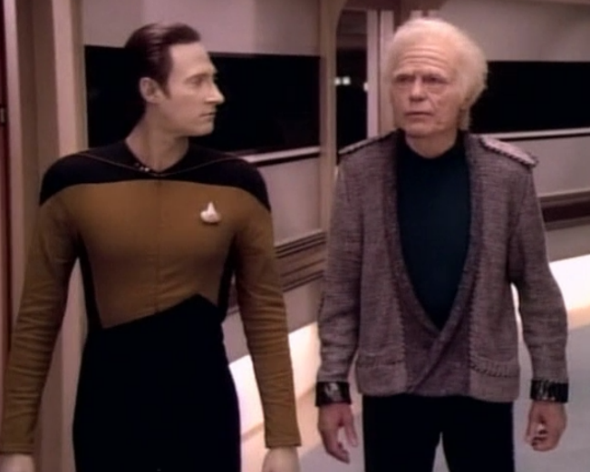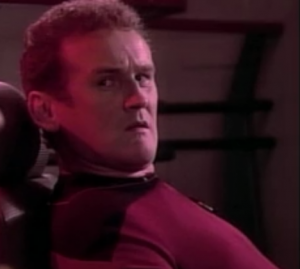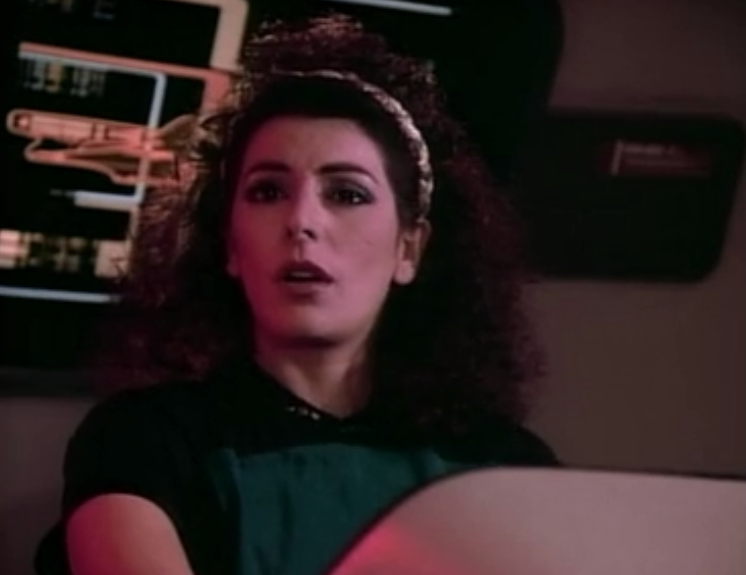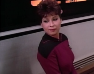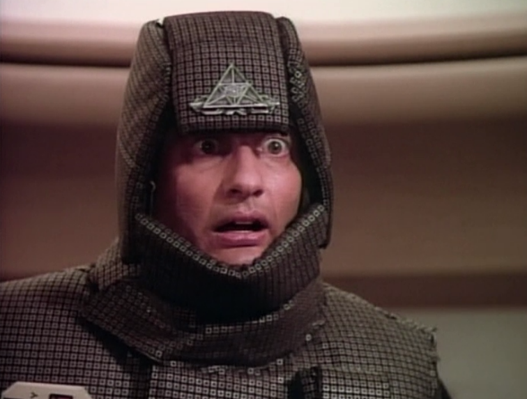 First is that the Q story is very good. Most people recognize this. They acknowledge how John de Lancie and Patrick Stewart do a fantastic job. A.V. Club’s Zack Handlen (who gave this episode a B-) brings up a good point that the stakes of the Q story are only really felt when Q is actually on screen. This is true, and it’s also true that we never actually believe Q will destroy everyone, but there are still great scenes (like the courtroom one) that have a real sense of danger. Having Picard facing down Q in a room full of people mocking and shouting is very effective. If I’m honest, I found these courtroom scenes so compelling that it may be the primary reason for liking this episode. These scenes cover familiar themes in Star Trek, but maybe one of the best iterations in a single sequence. This is exactly what a premiere of TNG should include.