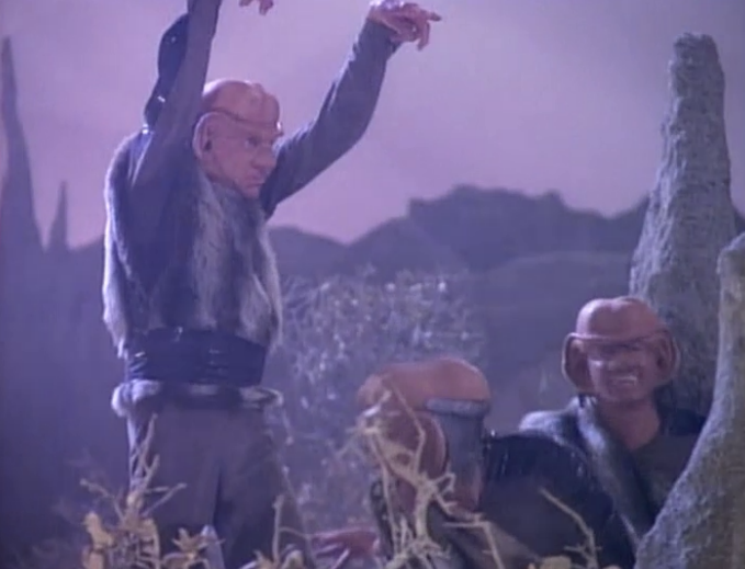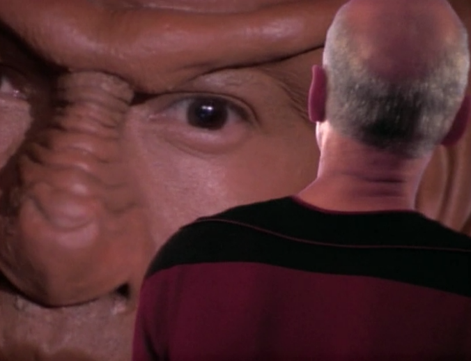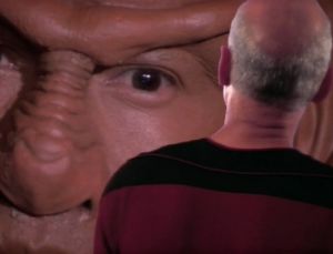 10:01- “I say fight, sir!” -Worf 12:53- Picard: “opinions please” … Worf: “…Hit them hard and hit them fast” In the beginning of TNG, almost every time Worf speaks it’s to suggest fighting, no matter the circumstance.