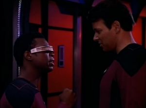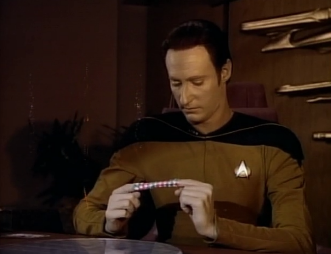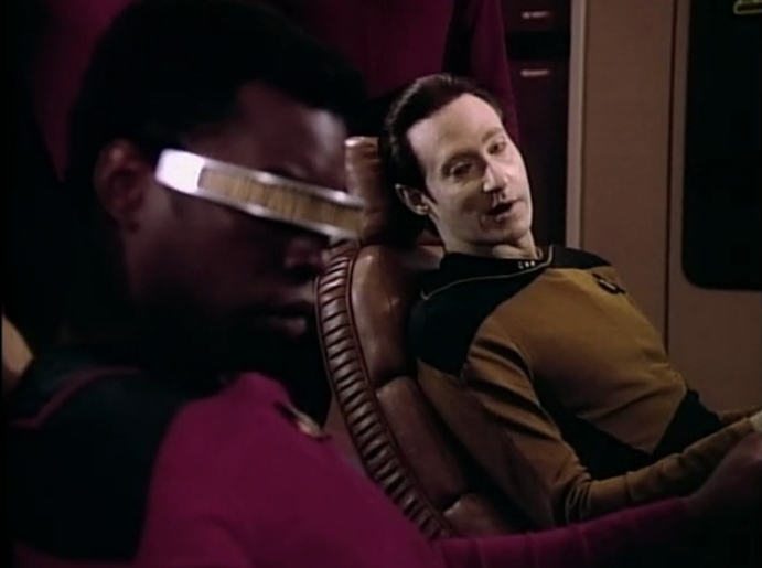 Riker shouts out in search for the rest of the away team while only about 30 feet away Data just stands on a giant crystal staring at it. What’s with Data in this episode?