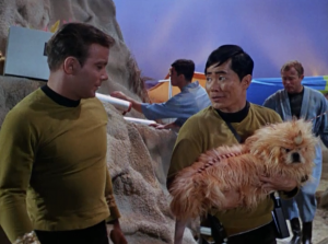The priority of beaming people up from the surface was 1. Geological Technician Fisher (because he was injured) 2. Captain Kirk 3. Sulu’s freak dog? all by itself?