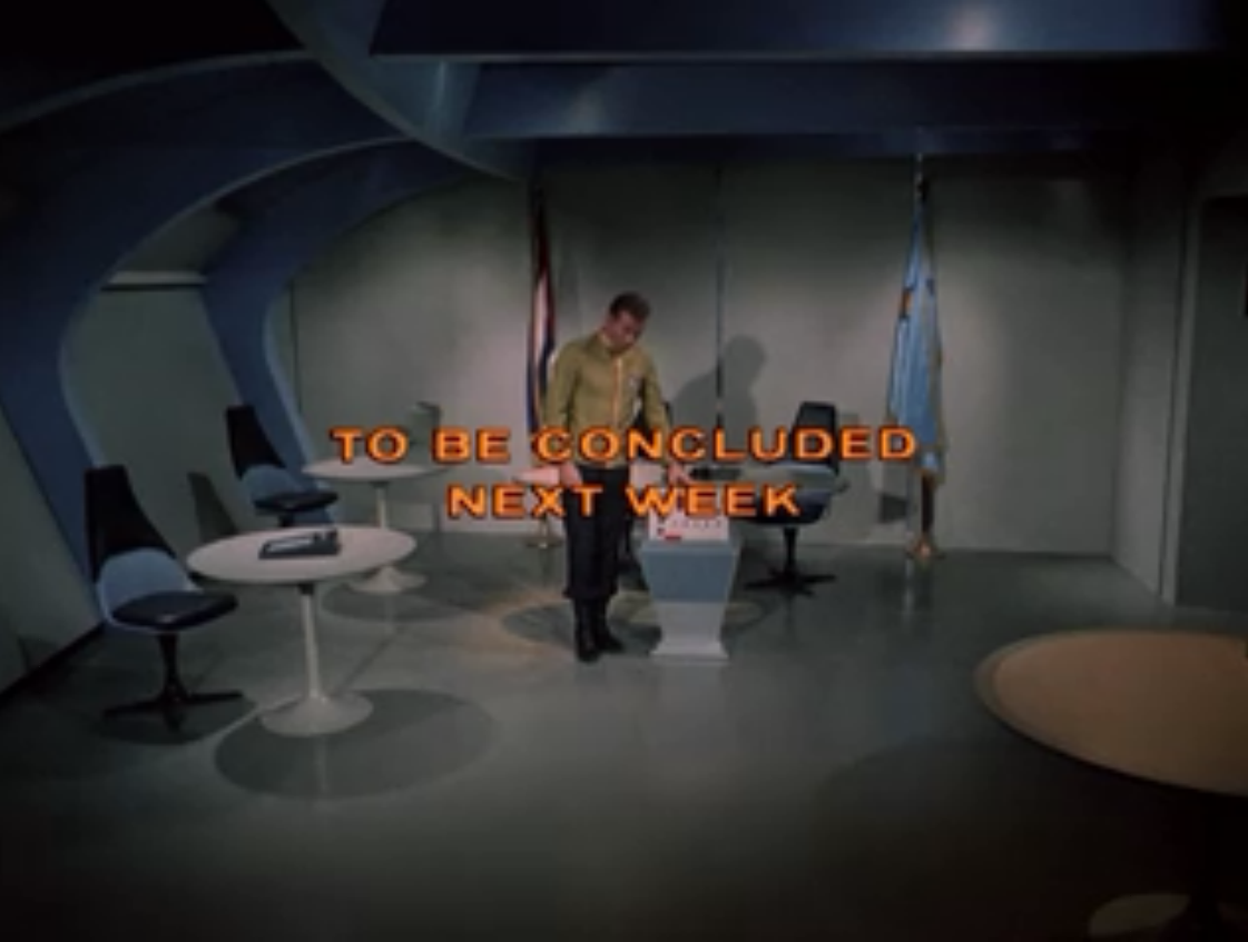To be concluded next week?! By the way, the threat that our heroes will face the death penalty by Starfleet for trespassing on a forbidden planet is about as unbelievable as stakes can get. But still, a cliffhanger!