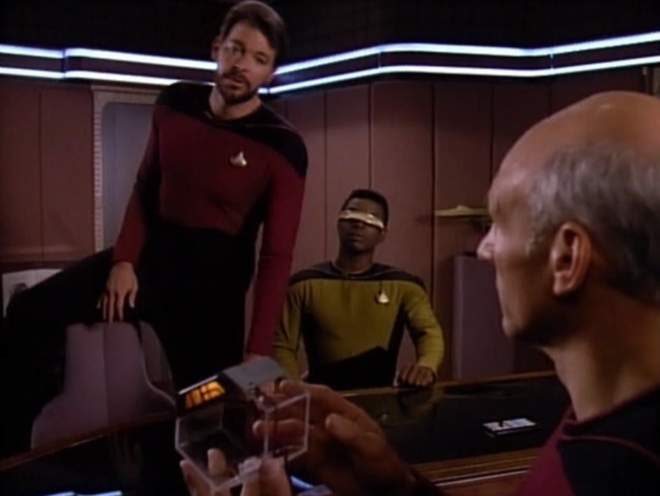 Geordi ← Previous Next → Geordi in gold too! He’s the new chief engineer! Also, it’s REALLY cool how Riker sits in chairs. He doesn’t have time to go around