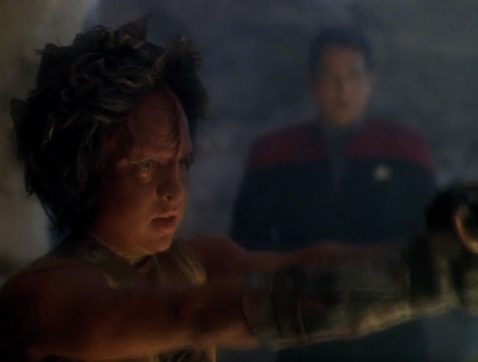 Kar ← Previous Next → Chakotay comes up with a plan for Kazon-Nog to kill him so he can earn his name, and then The Doctor can just revive him. Kazon-Nog decides to kill the Ogla leader instead.