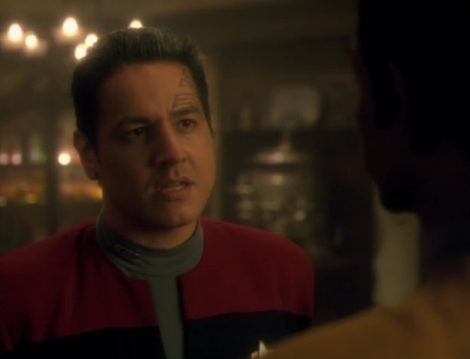 Chakotay ← Previous Next → As the crew faces death, every starts touching each other and saying nice things, except for Chakotay who tells Tuvok he’s arrogant and irritating…but one hell of an officer. Did he really need that first part?