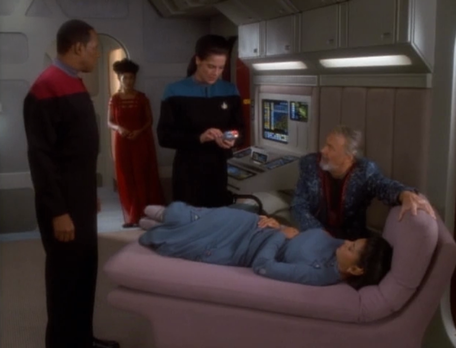 Sisko, Fenna, Dax, Nidell, and Gideon ← Previous Next → Worlds collide. The lady in red only appears when the real one is unconscious. It’s killing her!