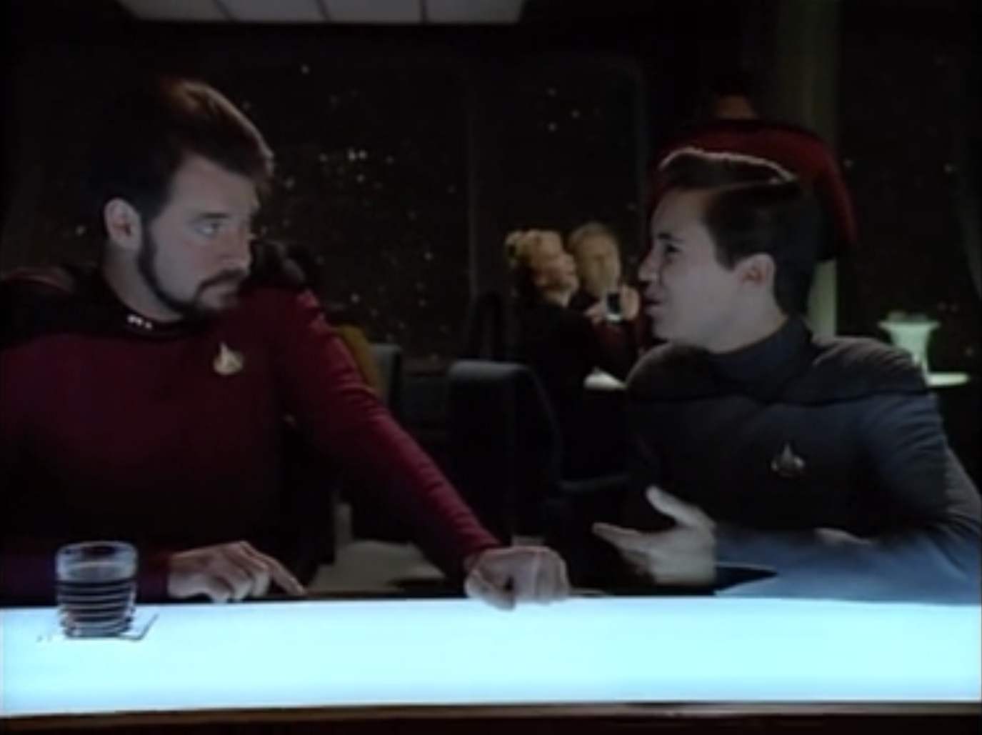 Riker and Wesley ← Previous Next → Wesley finally seeks advice from Riker. That makes more sense…Come to think of it, that’s a bad idea too. I guess there really isn’t anyone on Enterprise that Wesley should go to to learn how to talk to a girl.