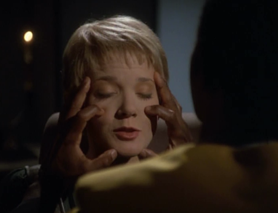 Kes in a mind meld ← Previous Next → Tuvok gives Kes a mind meld to teach her how to control her abilities