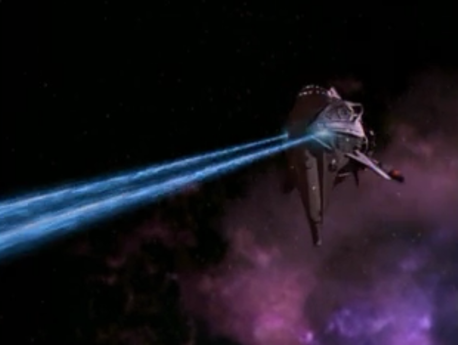 Kazon ship ← Previous Next → A Kazon ship was hiding in a cloud. They attack and know the rotation of shield frequencies for Voyager