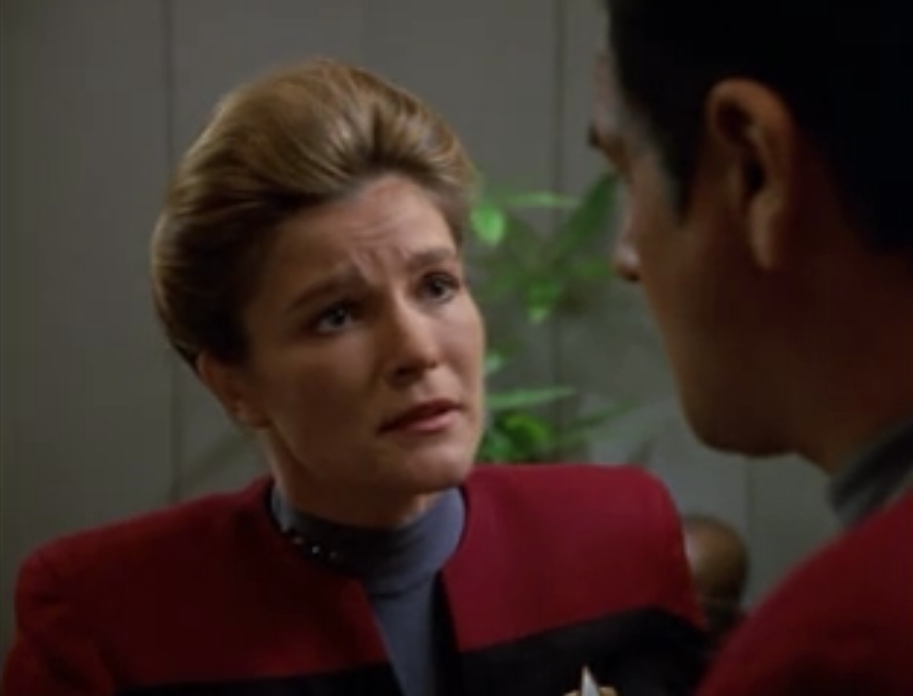 Janeway ← Previous Next → Janeway chews out Chakotay for his reckless decision. I think she went easy on him.