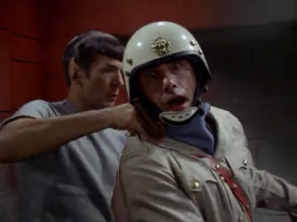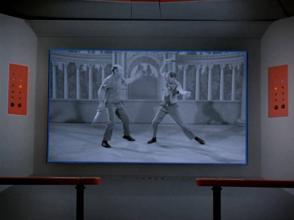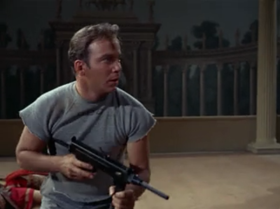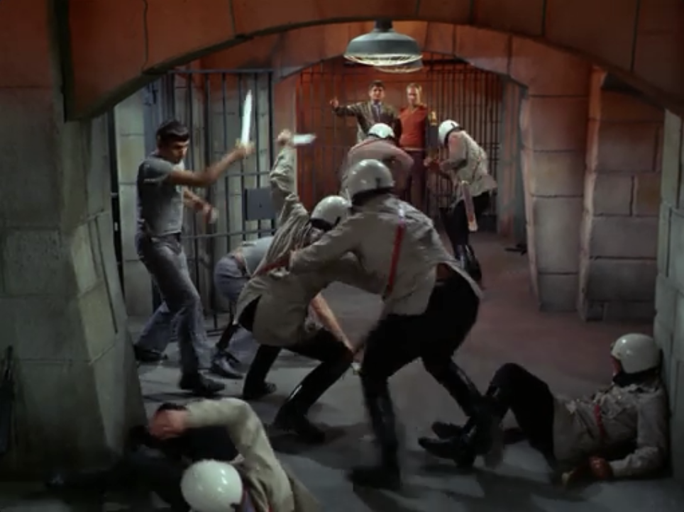 Kirk, Spock and Bones get pinned by guards armed with guns. Even though Kirk still has his gun, Claudius tells his men to use swords against Kirk because they don’t want to shoot their own men in the crossfire. I guess he didn’t think of the possibility of Kirk just using his gun to shoot everyone trying to attack him with a sword…