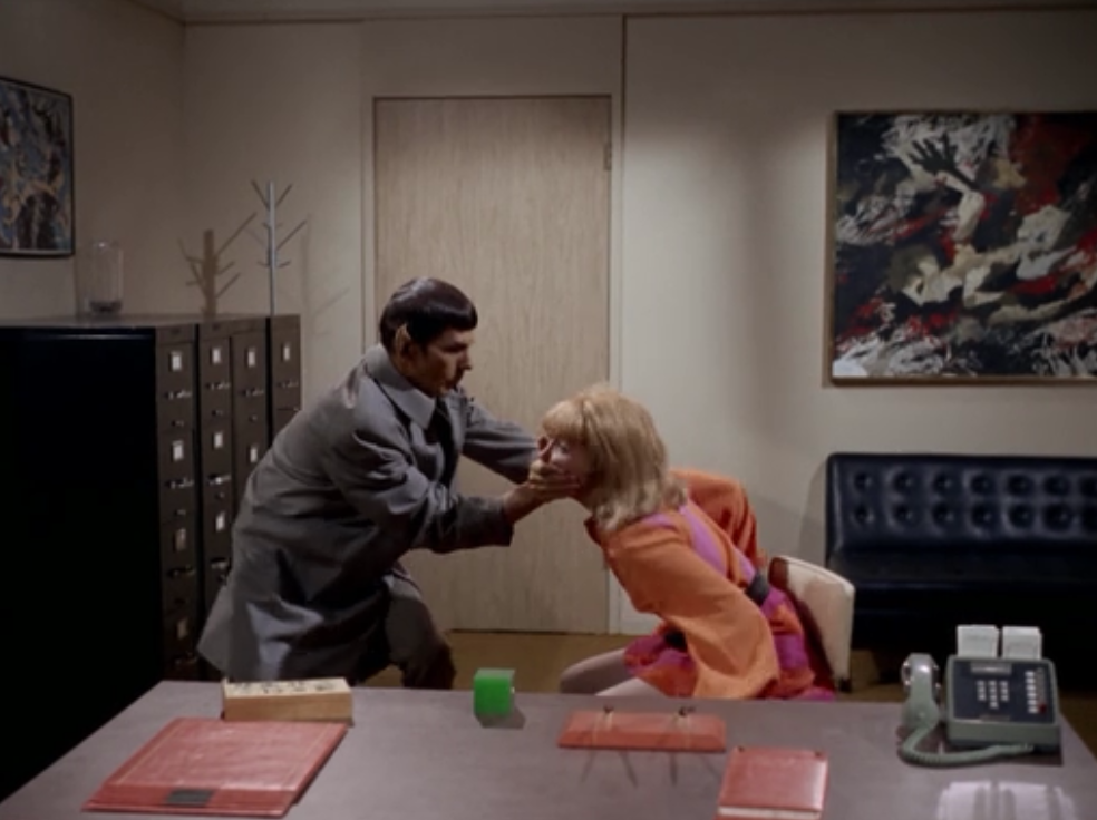 When Kirk and Spock find the room Spock wants to keep the lady quiet as long as possible before running away. She seems to be helping him out.