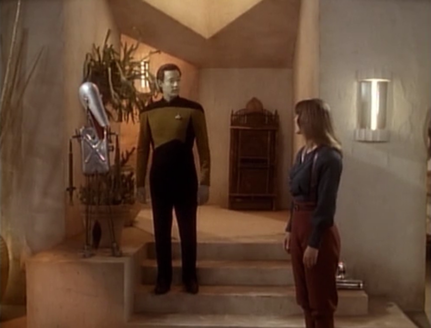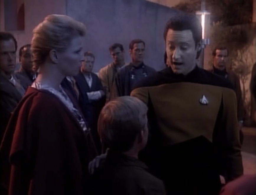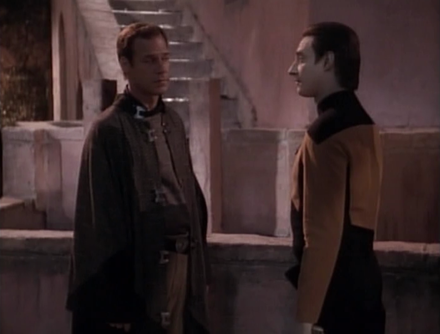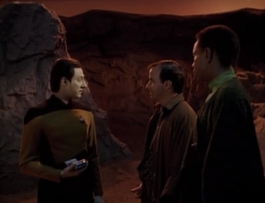The colonist leader says that they can’t leave because they have a lot of cool stuff, and water, and it was really hard to build this place, man. He doesn’t give great arguments, but Data is saving his best counter arguments for the climax of the episode