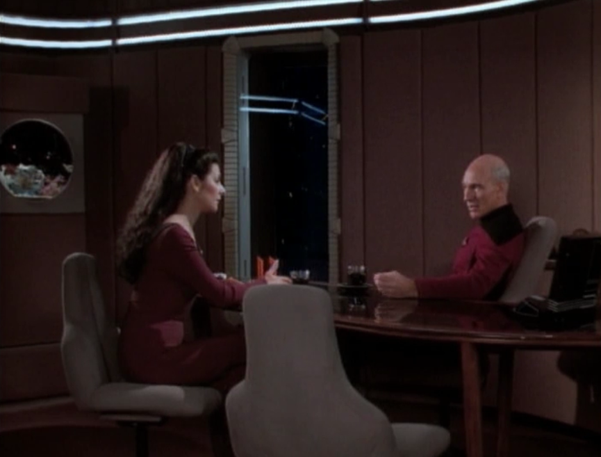 I like the scene of Troi and Picard talking about communication with aliens in general, and preparing to talk with the Sheliak