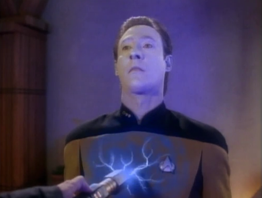 Data has a meeting with some colonists but that leader jerk wasn’t invited. He comes anyway and electrocutes Data