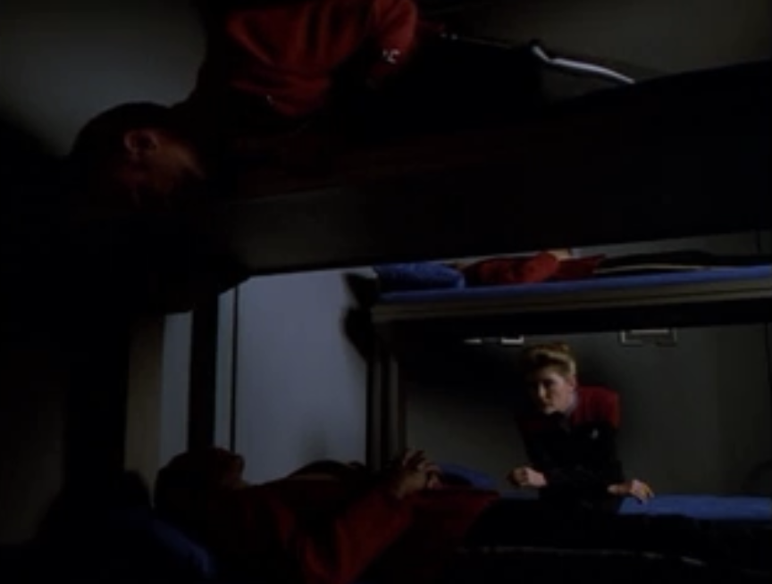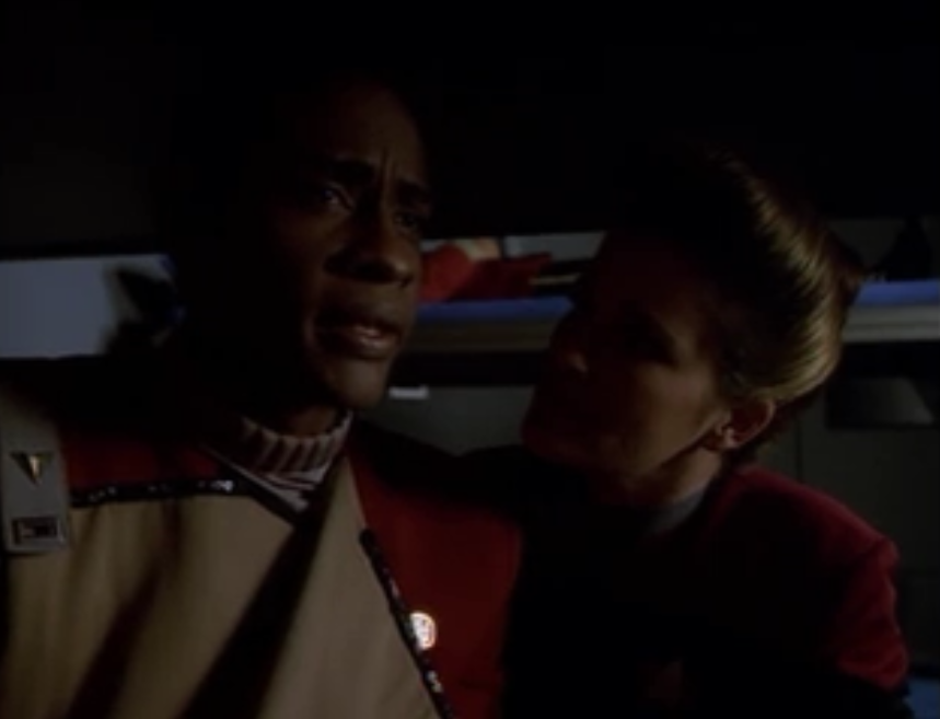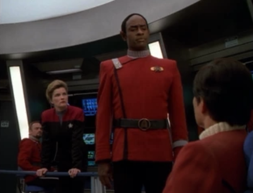 Tuvok’s mind starts to go, and now people can see Janeway. She steals Rand’s uniform