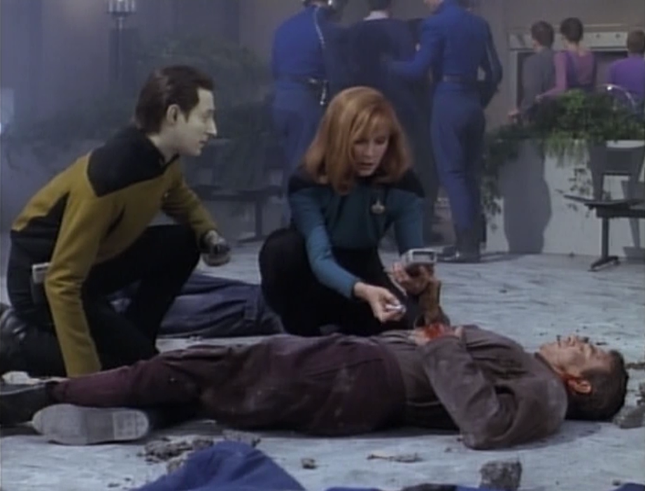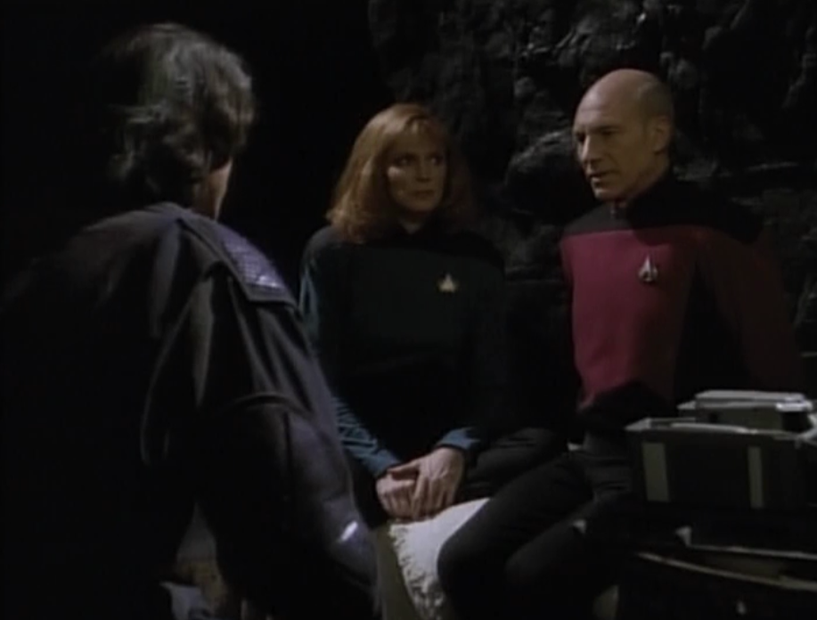 I also think they make interesting statements about the Federation’s involvement with this situation, criticizing the notion that they aren’t taking sides. I like that the terrorist criticizes Crusher for frowning upon him, even though she only enjoys the type of society she lives in because of the sacrifices people like him have made, which is partly a statement about his self-image, but also has some merit.