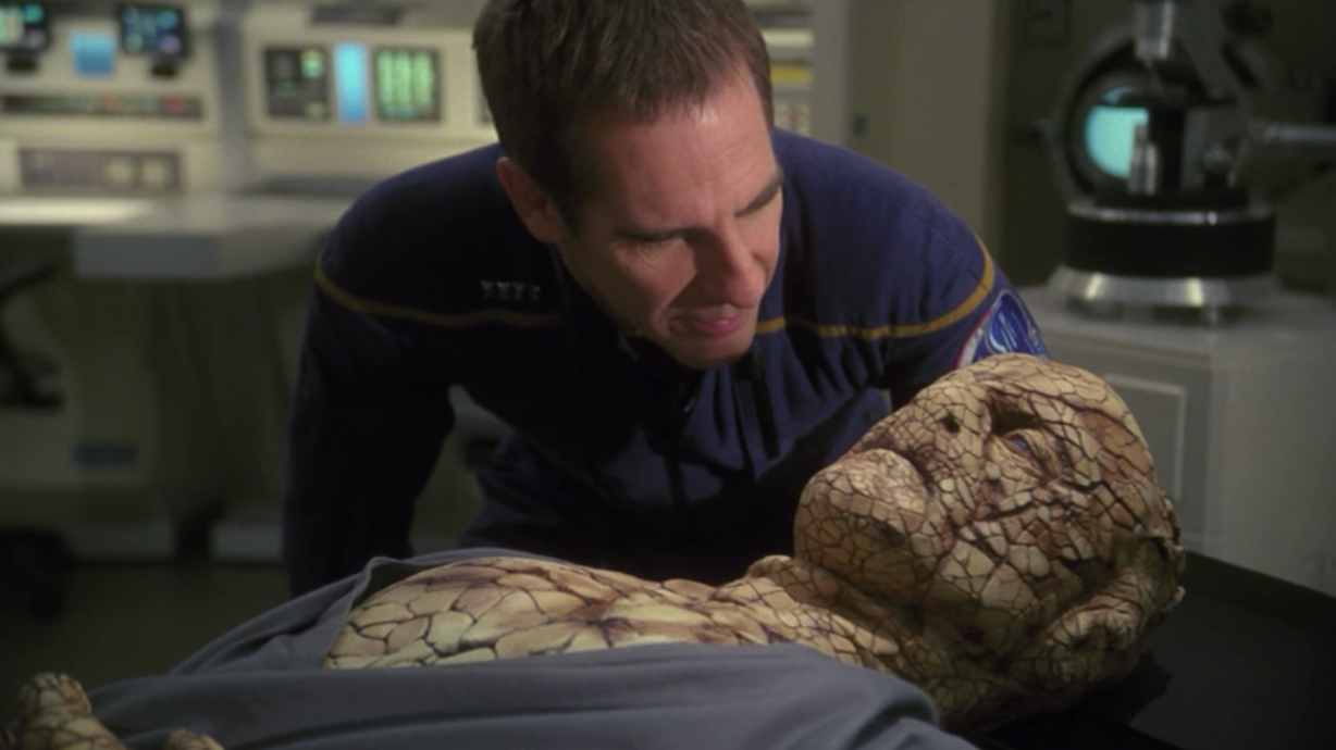 The guy’s ship is made out of the same stuff that the spheres are made out of. Archer wants answers but the guy is too busy dying.