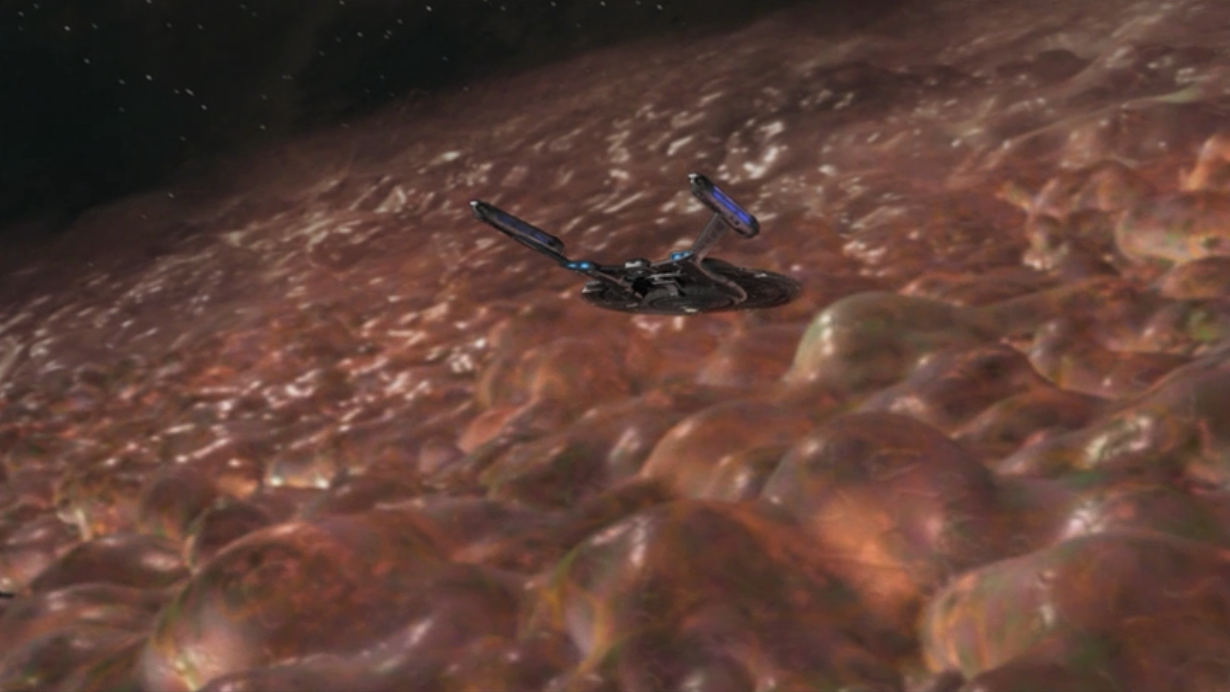 They come across a big gross ball of something in space. There’s a pod stuck near the edge with a life-sign!