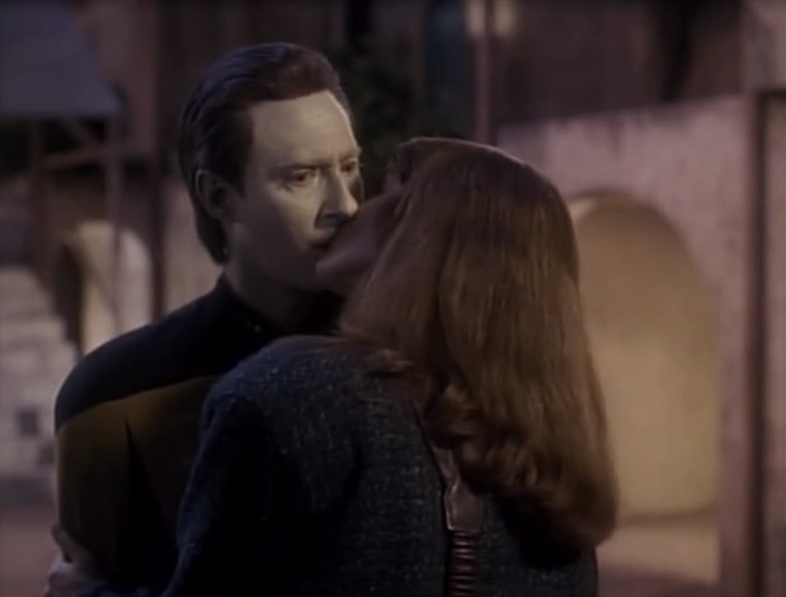 In “The Naked Now” Yar and Data get drunk and have sex. The scene is actually even more awkward than it sounds. Yar talks about her tragic upbringing and escaping rape gangs, but also the scene is kind of played for laughs…