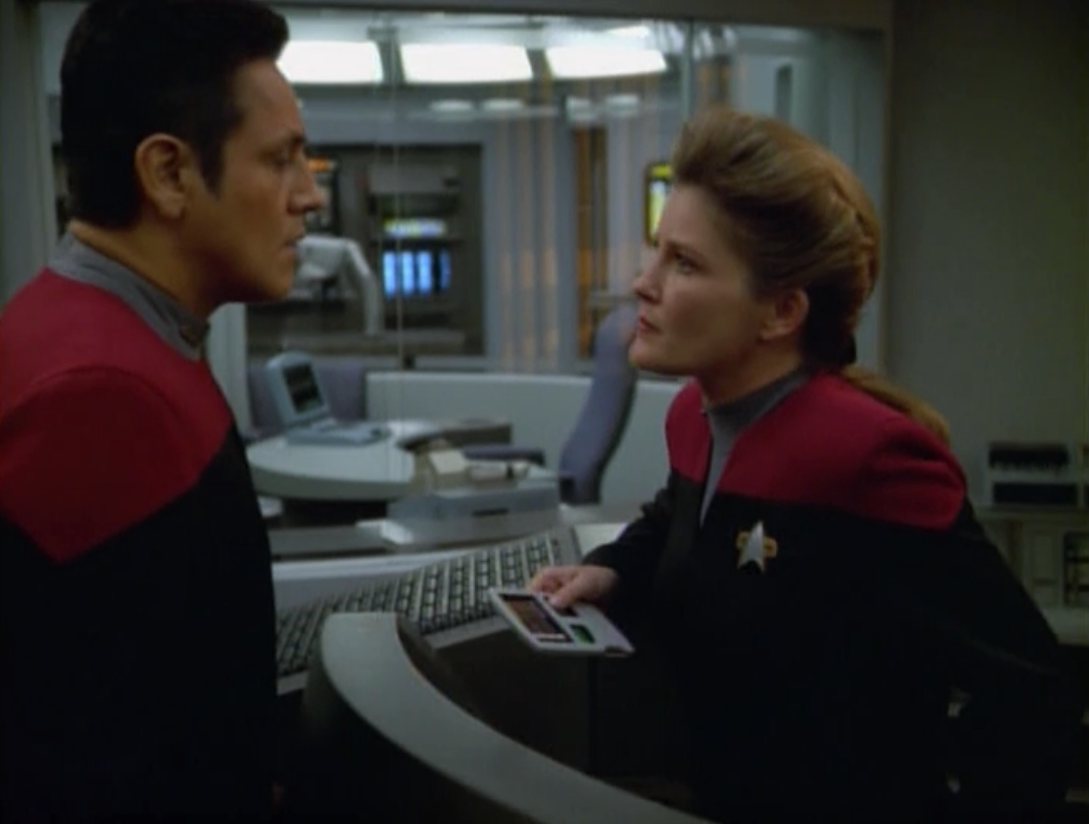 But then Janeway gives the code word to Chakotay to plug himself into her mind. He tries to appeal to her humanity, but it doesn’t work.
