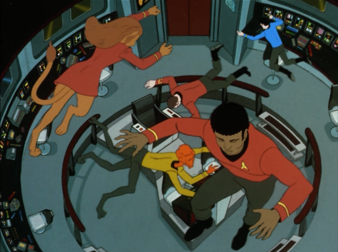 Bones and Sulu beam up and make their way to the bridge and are half way through explaining what’s going on before Scotty gets around to telling them he wasn’t able to beam up Uhura.