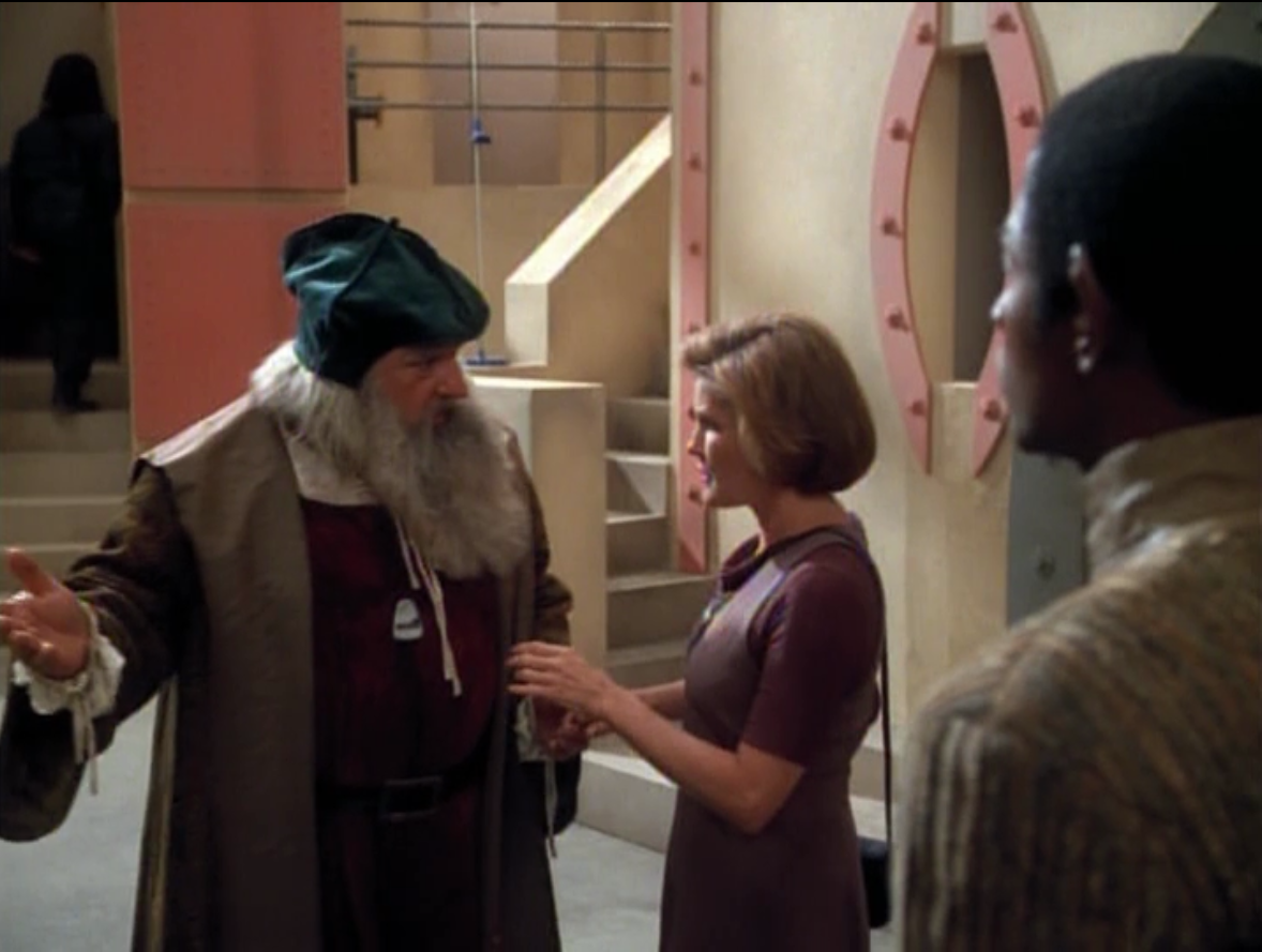 janeway and leo ← Previous Next → While trying to locate their stuff, Janeway goes to a market and finds da Vinci with the mobile emitter