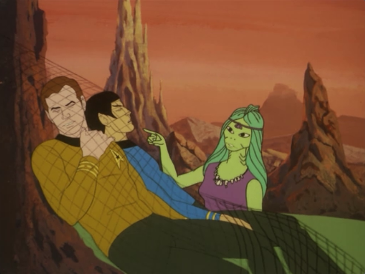 Kirk and Spock ← Previous Next → They try to sufficate them on some rocks, but one of the young ones points them out to Scotty, who was looking for them