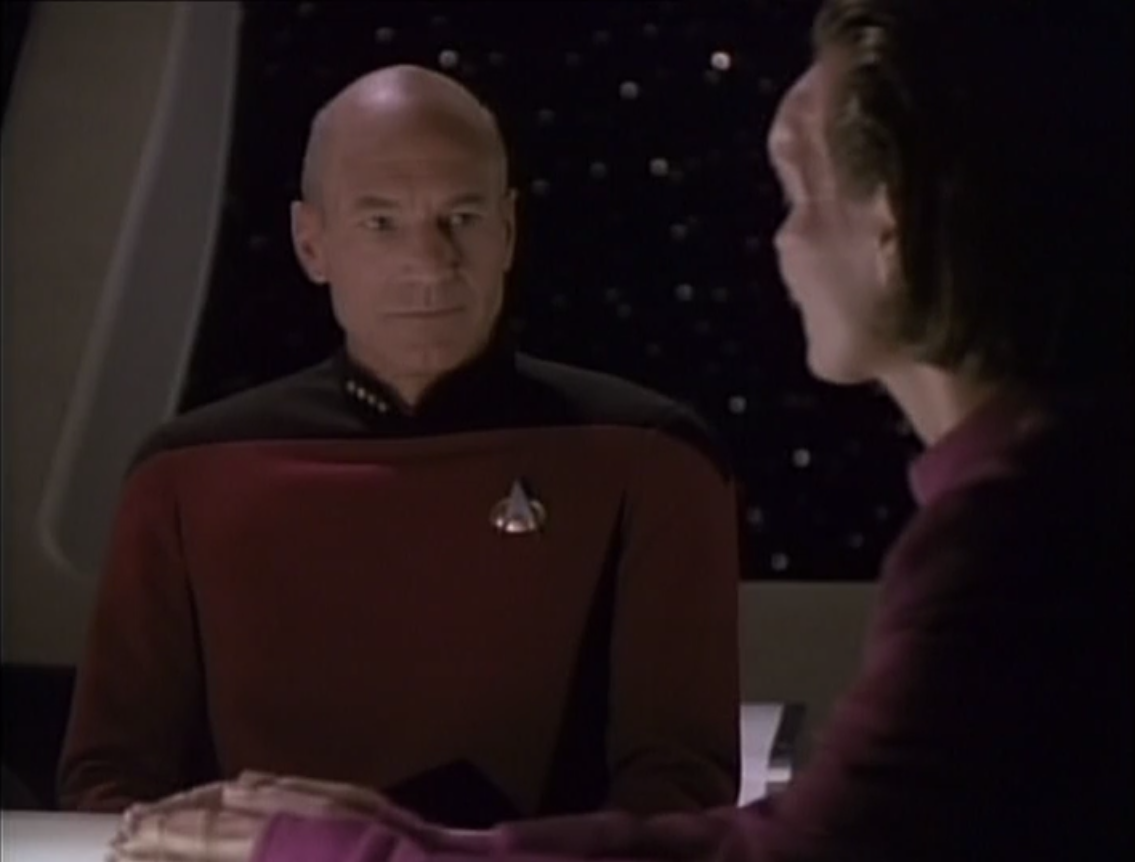 picard ← Previous Next → First they talk to a scientist because she seems cool. She tells Picard not to mention the Riker/spy stuff when meeting with the leader, but she’ll help find Riker