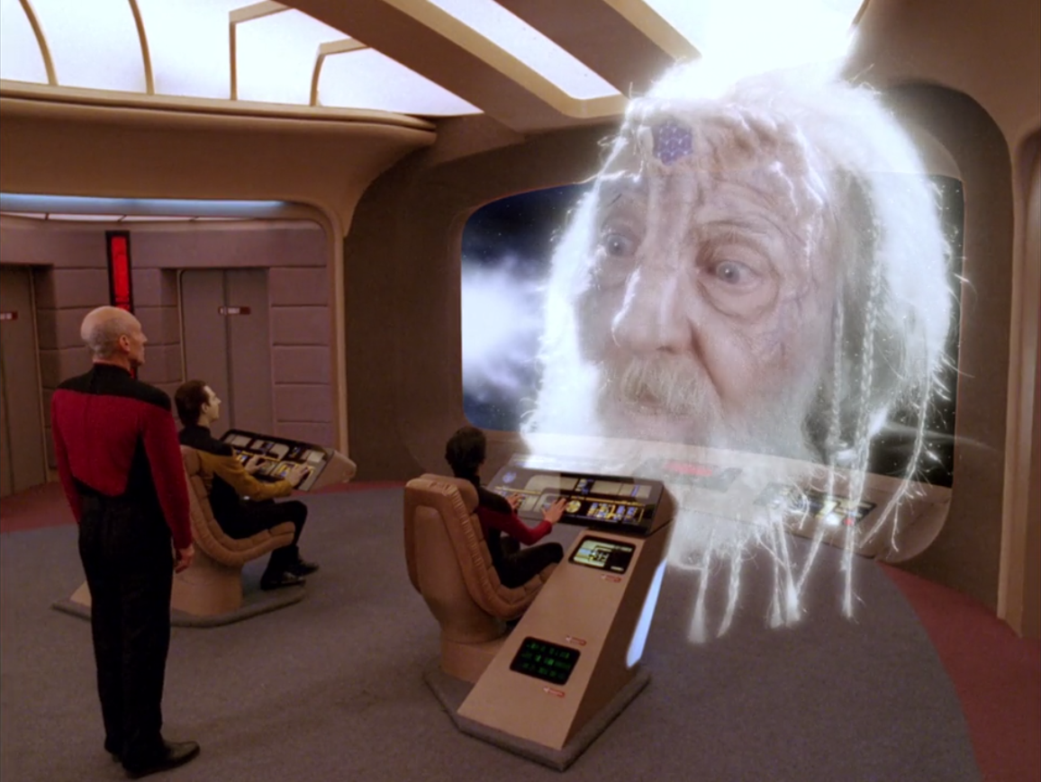 giant face ← Previous Next → There’s a giant face there. Barclay explains that these aliens a like lazy or something so they just bring new aliens to them, by giving one of them super powers