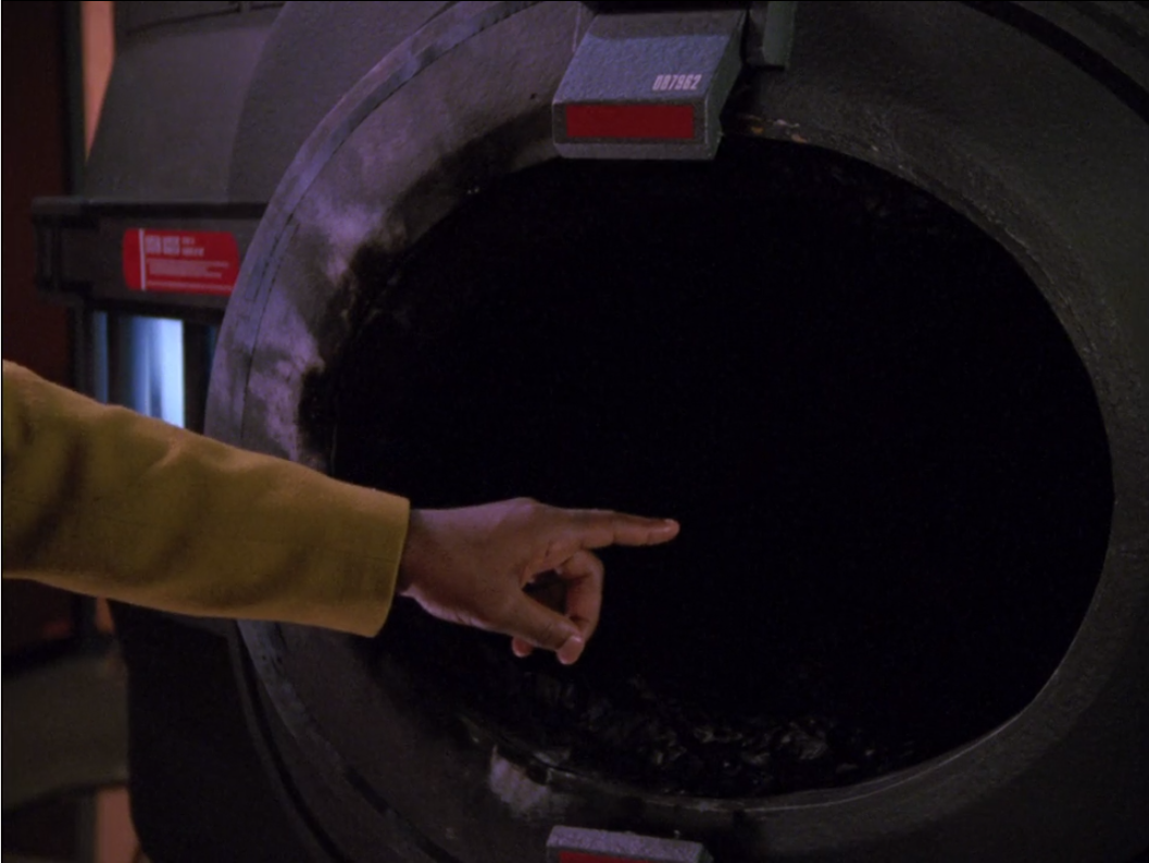 Geordi points at a thing to show that the sabotage was just a malfunction
