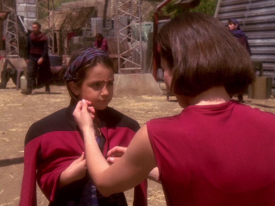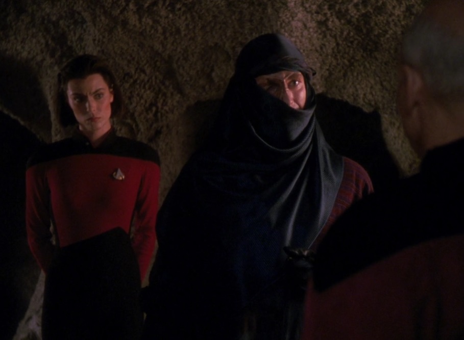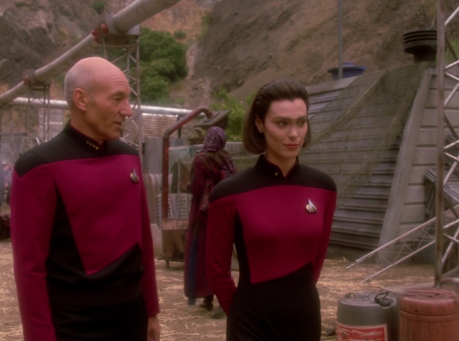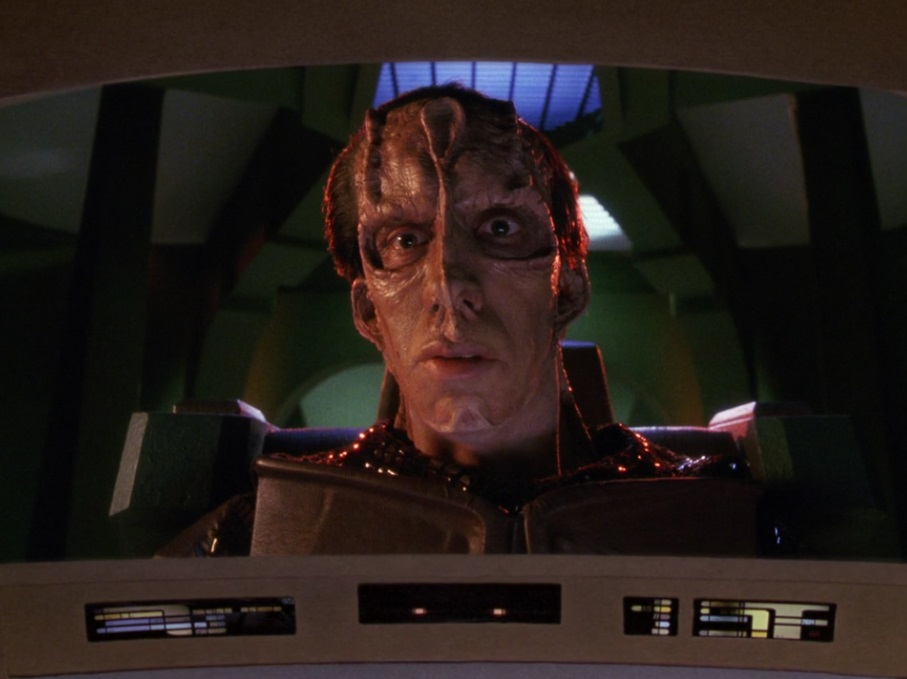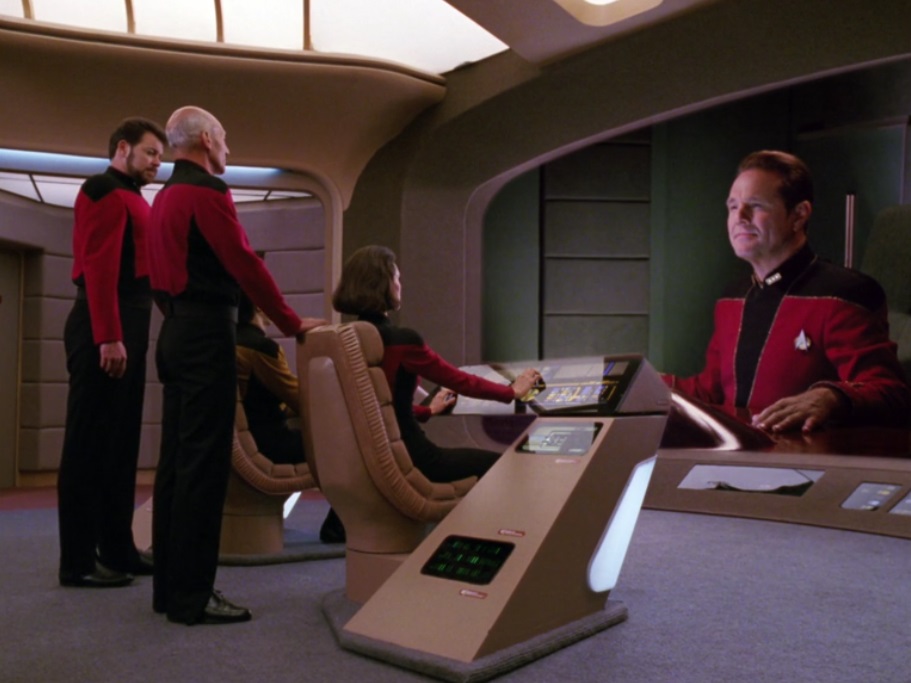 For real, though, this is an all around good episode. It introduces the foundational political situation between the Federation, Cardassians, and Bajorians, a scenario rich enough that it serves as the setting for the entire Deep Space Nine series. The plot is built on something of a stock Trek formula, but not one that is utilized as frequently as others, and the beats are played well enough that there’s plenty of life in them. (It features a simple but especially satisfying bad-admiral-commupance scene near the end.) They hit the “Ro is tuff and doesn’t play by the rules” thing a *little* too hard, and the crew’s intense prejudice toward her is clearly there to serve the narrative arc, but it’s at the expense of character consistency. Ro as a character is immediately great. Michelle Forbes sells the toughness, something that is often not achieved in Star Trek, but she also conveys Ro’s vulnerability without it undermining her formidable presence. The character’s outsider perspective on Starfleet spices up the crew dynamic in a welcome way. The personal histories of the bridge crew can often be a little underdeveloped and same-y, so Ro Laren’s baggage is a nice way to freshen things up.